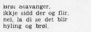 Viserefrenget begynte sterkt med « Brøl Stavanger , de’ det du ska’ ha. Då blir du hjerteglad , vekk med alt søl..»
