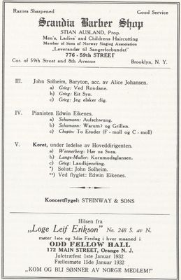 John Solheim var vaskeribestyrer ved siden av å studere sang. Han hadde sin debut sammen med romkameraten i leilgheten døpt "Kakkerlakkenheim", pianist Edvin Eikenes, ved Sønner av Norges Sangerforbund i Brooklyn Academy of Music i 1931.